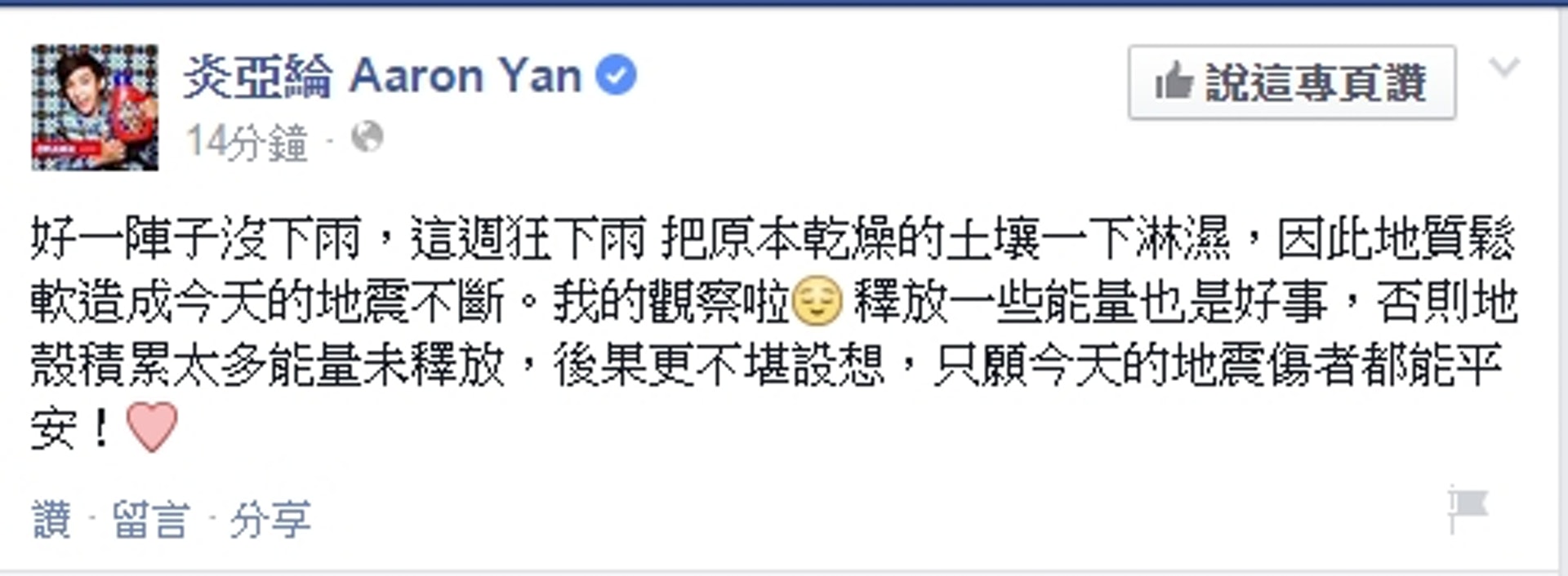 地震搖晃有感炎亞綸5年前 下雨地震說 引朝聖先知 華視新聞網